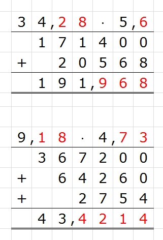 Die beiden folgenden Beispiele (vgl. Skizze) zeigen, wie die Multiplikation von Dezimalbrüchen durchgeführt wird. Zunächst multipliziert man die vorgegebenen Dezimalbrüche ohne Beachtung der Kommata.