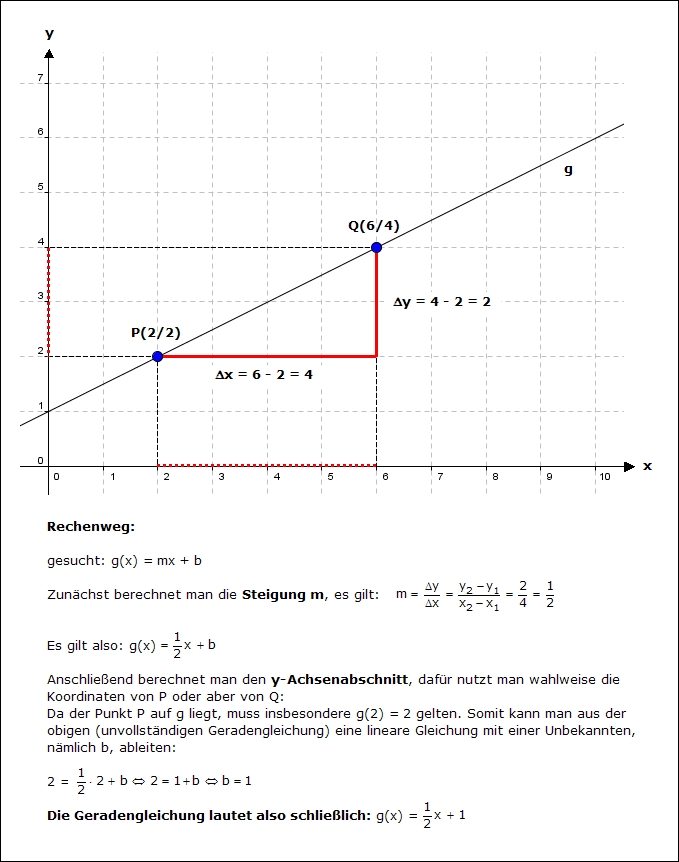Lösungsbeispiel:Die Punkte P(2/2) und Q(6/4) beschreiben eindeutig eine Gerade g, bestimme deren Funktionsgleichung! Bedenke bei diesem Aufgabentyp unbedingt die zahlreichen Kontrollmöglichkeiten Deines Ergebnisses. Hat die Gerade steigende Tendenz, so muss m positiv sein, hat die Gerade hingegen fallende Tendenz, so muss das m negativ sein. Ferner ist der y-Achsenabschnitt b als die y-Koordinate des Schnittpunktes S von g mit der y-Achse abzulesen. Und nicht zuletzt kann man beide gegebenen x-Werte abschließend zur Probe in die gefundene Geradengleichung einsetzen und überprüfen, ob sich dabei tatsächlich die vorgegebenen y-Werte ergeben.